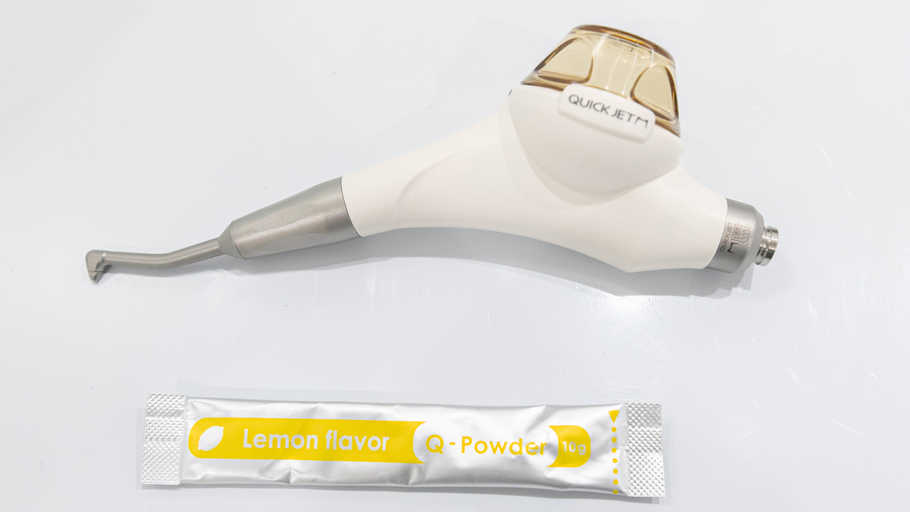 細かなパウダーを歯の表面に吹き付け、バイオフィルム(細菌の膜)、プラーク(歯垢)、茶渋、タバコのヤニなどを落とします。