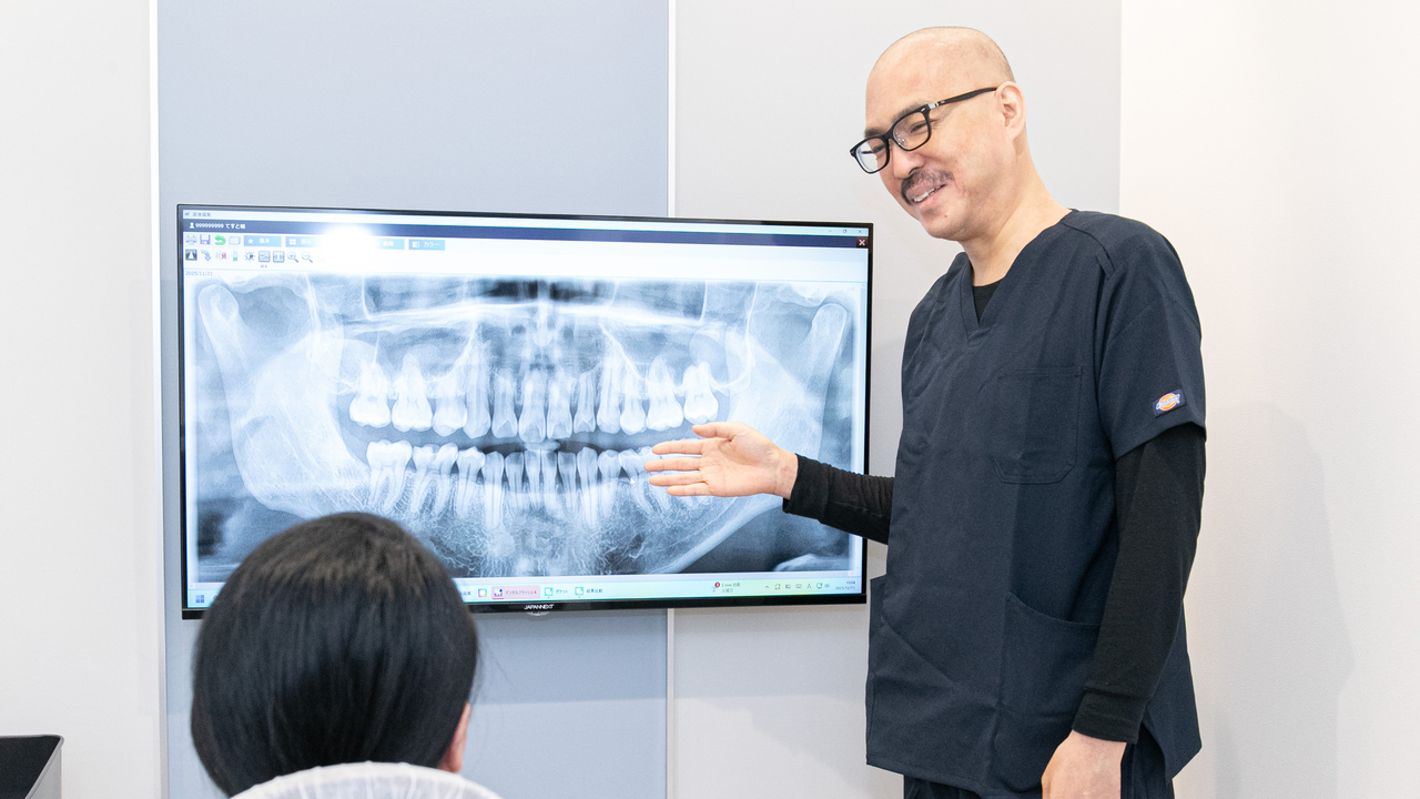 現在のお口の状況について説明いたします。お口の状況をお伝えする際に、レントゲン写真や図・イラストを使用。具体的な治療法の説明、その治療法によるメリット・デメリット、費用、治療にかかる期間についても説明します。