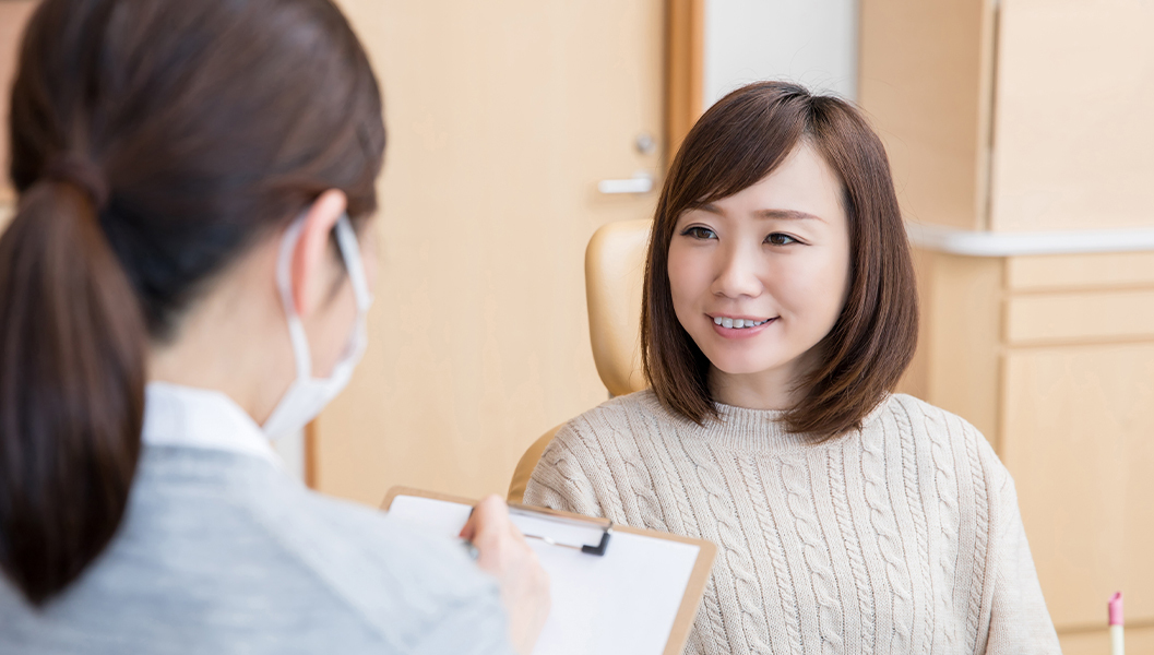 診療台にて問診を行います。どんな症状があるのか、いつから症状があるのか、痛みがあるか、あるならどの程度痛いのかを確認。また、治療に不安があるか、治療への希望、過去の治療で嫌だったことをヒアリングします。