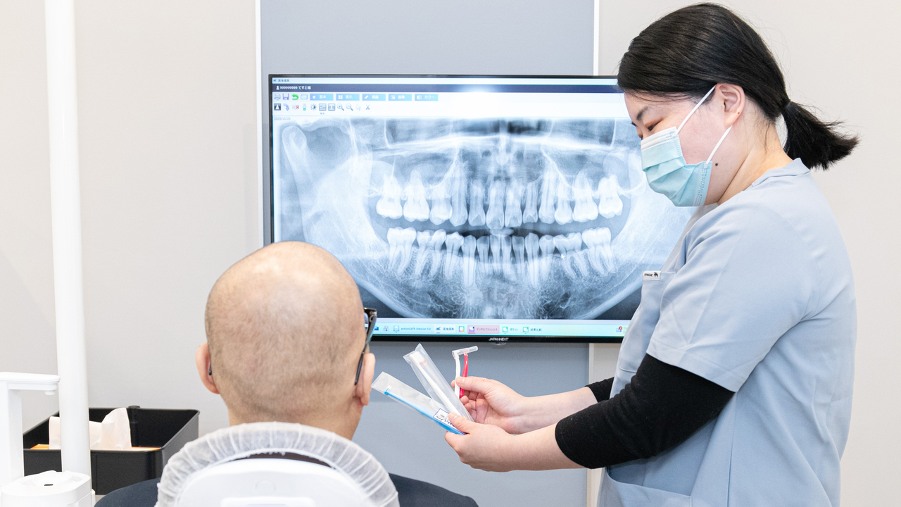 そこで私たちは、一人ひとりのお口の状態やライフスタイルに合わせた歯磨き指導を実施しています。無理なく続けられる方法を身につけていただくことで、効果的なセルフケアが可能に。患者さまが使いやすいケアグッズのご提案も行い、院内で購入いただけるようにしています。